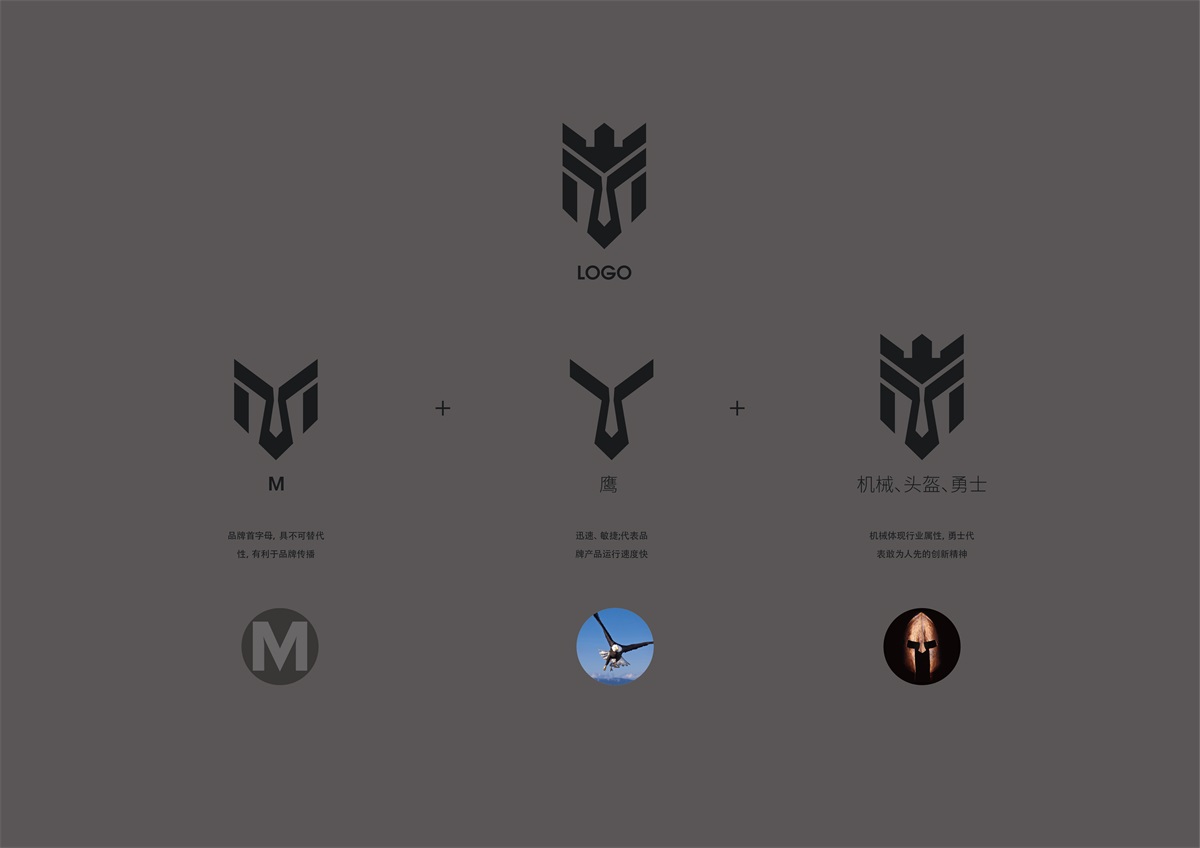 品牌LOGO以字母M、鷹、頭盔、勇士、機(jī)械巧形象妙結(jié)合成而成,字母M是品牌首字母,具有不可替代性,有利品牌傳播;鷹代表迅速、敏捷,寓意品牌產(chǎn)品運(yùn)行速度快;盔甲、勇士、機(jī)械體現(xiàn)行業(yè)屬性,勇士代表敢為人先的創(chuàng)新精神;搭配無(wú)襯線字體,使整體視覺(jué)感強(qiáng),簡(jiǎn)約、時(shí)尚、科技。