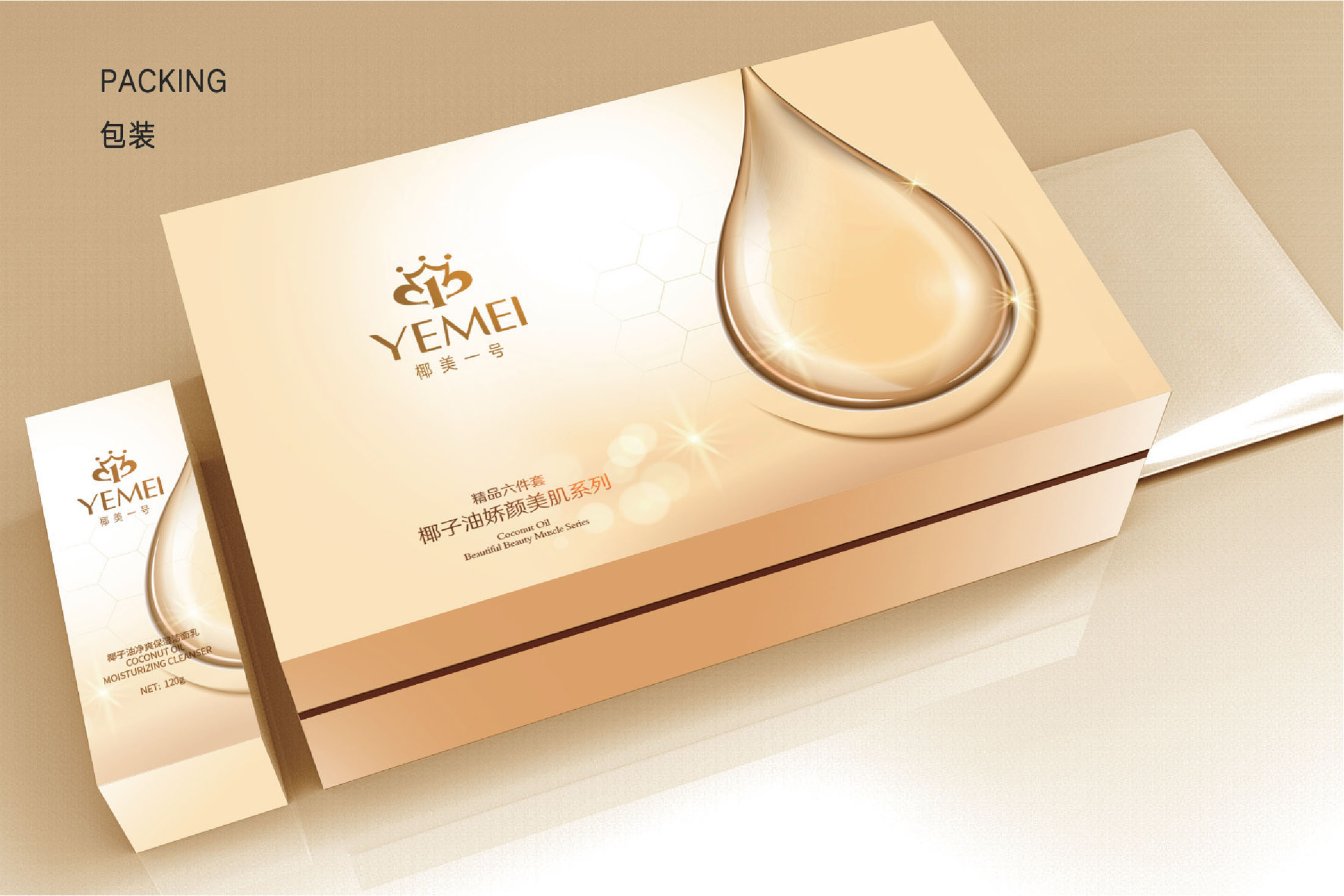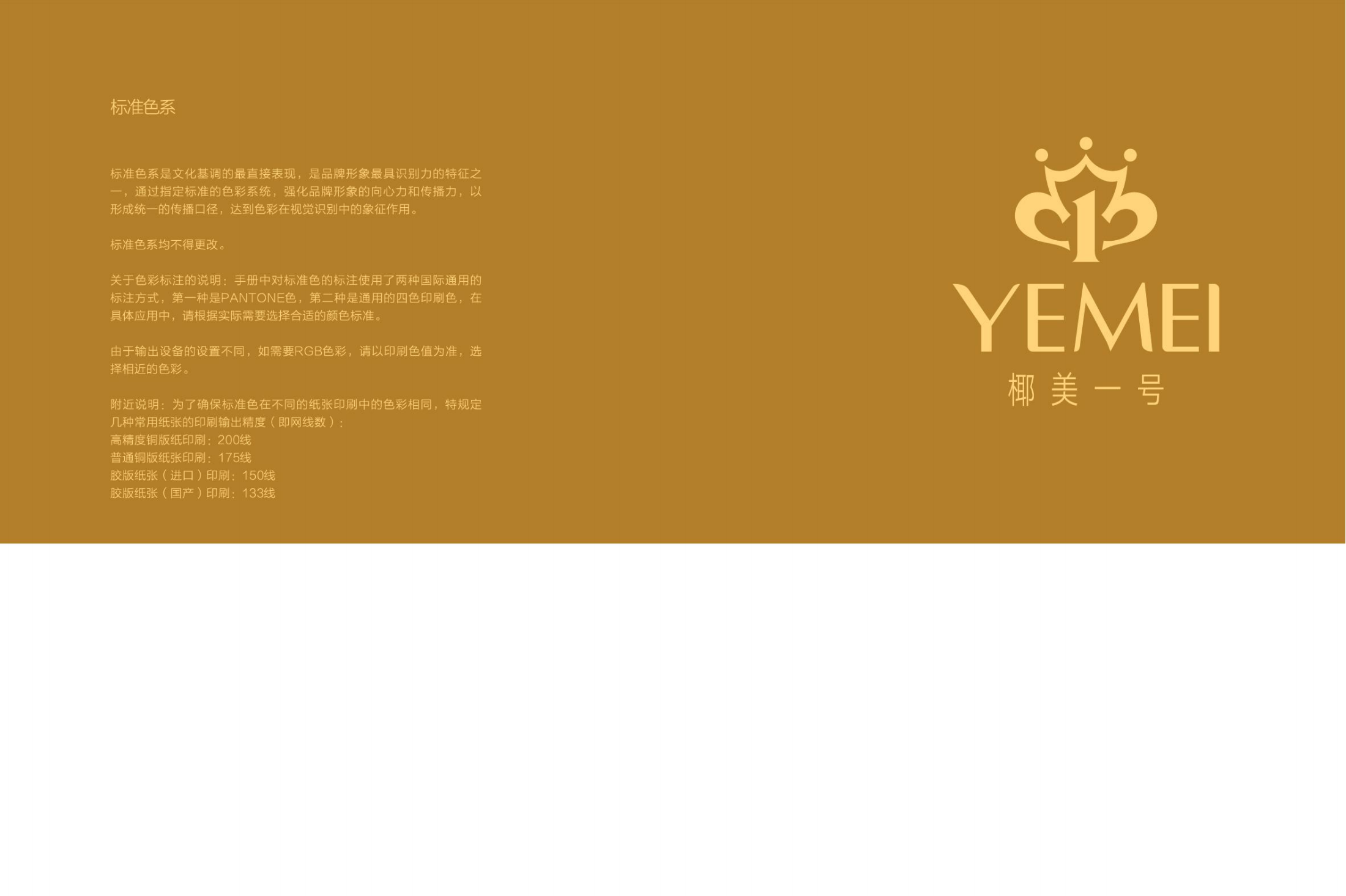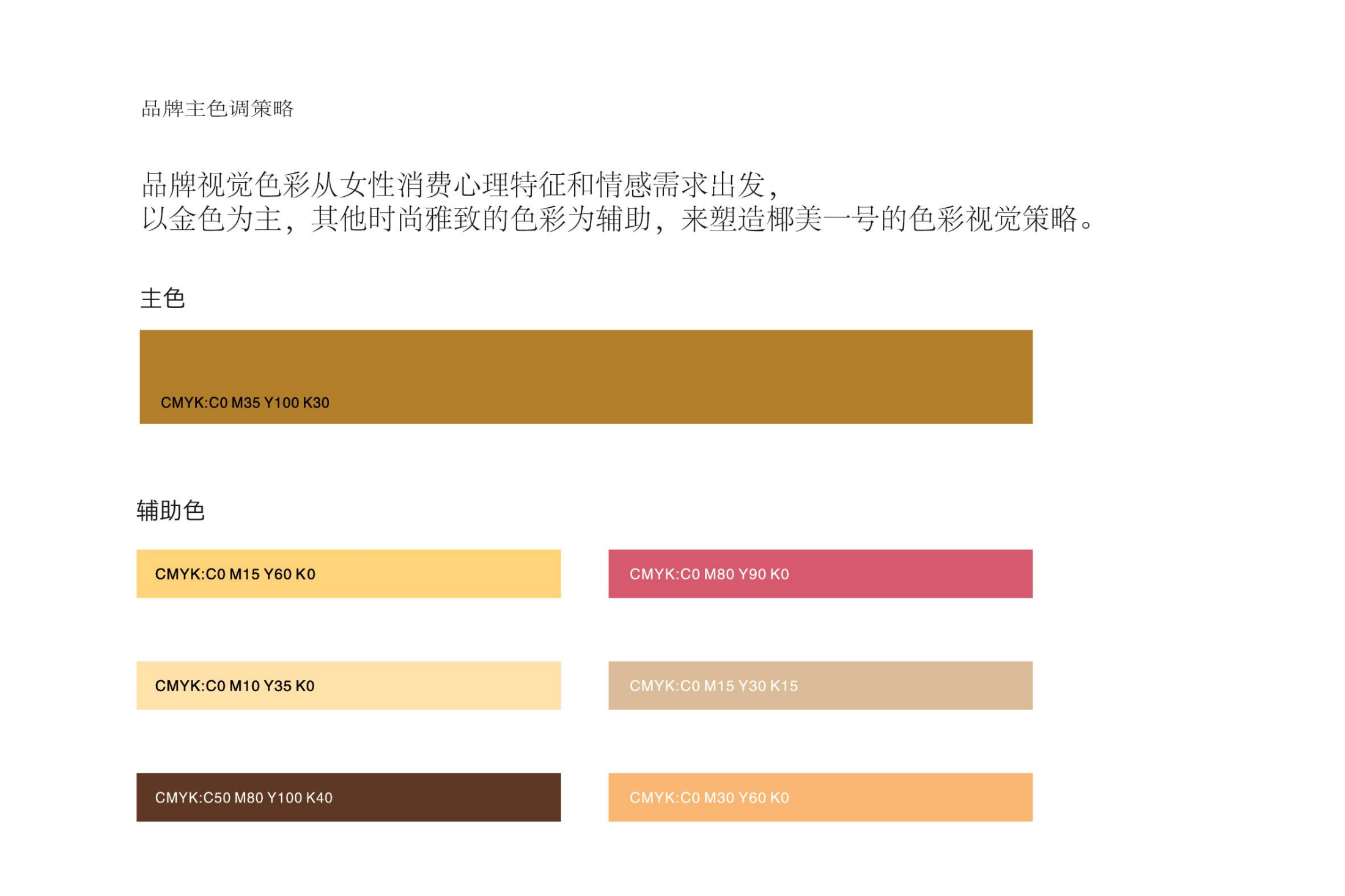 有策略的品牌視覺,一定需要具備良好的色彩分析技巧,以達到符合品牌行業屬性、以及定位。品牌視覺色彩從女性消費心理特征和情感需求出發,以金色為主,其他時尚雅致的色彩為輔助,來塑造椰美一號的色彩視覺策略。 金色,是椰美一號的靈魂色,承載著女性的愛和喜歡的品牌緣起。 金色,也代表著高貴,地位,性感。 每個女性都希望被金色的魅力包裹。