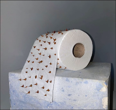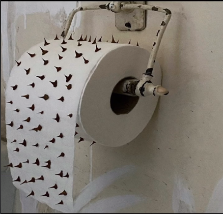 當你哪天上廁所忘記帶紙巾的時候,墻上掛著這卷紙巾,你是擦還是不擦?或許你也會想,這個人是有多無聊,才會把刺一顆一顆的沾上去、、、、、